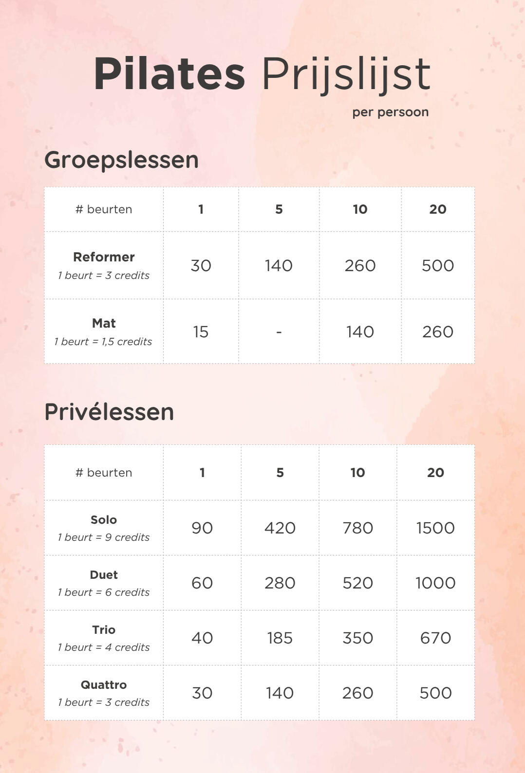Hierbij vind je de prijslijst. Een proeflesje Group Reformer kost 18 euro. Koop je een beurtenkaart, dan wordt deze automatisch omgezet in credits. Zo kan je met een beurtenkaart zowel groepslessen Reformer, matlessen en privélessen boeken.De uurrooster wordt elke zondag gepost in de stories op Instagram @reformerroom.be en pin ik deze in de highlight uurrooster.Wil je graag meedoen voor de eerste keer? Dan mail je mij op [email protected] of stuur je een DM op Instagram @reformerroom.be. Je geeft mee welke les je wilt volgen, je volledige naam, je telefoonnummer en je e-mailadres. Dan maak ik een account aan in mijn appje en krijg je een mail met een downloadlink voor het appje en tijdelijke login-gegevens. Vanaf dan kan je beurten of beurtenkaarten aankopen, het uurrooster raadplegen en zelf je lessen boeken.Tijdens een Reformerles draag je grip socks, die te koop zijn in heel wat winkels (Decathlon, Calzedonia, Veritas ...) en je kan er ook in de studio kopen voor 10 of 17 EUR. Voor je proeflesje mag je gerust sokken lenen uit mijn persoonlijk collectie.Belangrijk! Je kan je les tot 12 uur voor de les kosteloos verplaatsen. Bij verplaatsing minder dan 12 uur voor de les zal je les worden aangerekend.